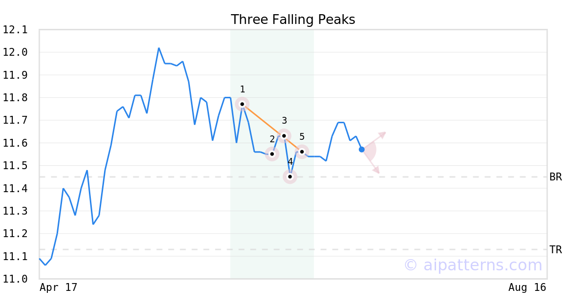 The Three Falling Peaks pattern forms when three minor Highs (1, 3, 5) arrange along a downward-sloping trend line.