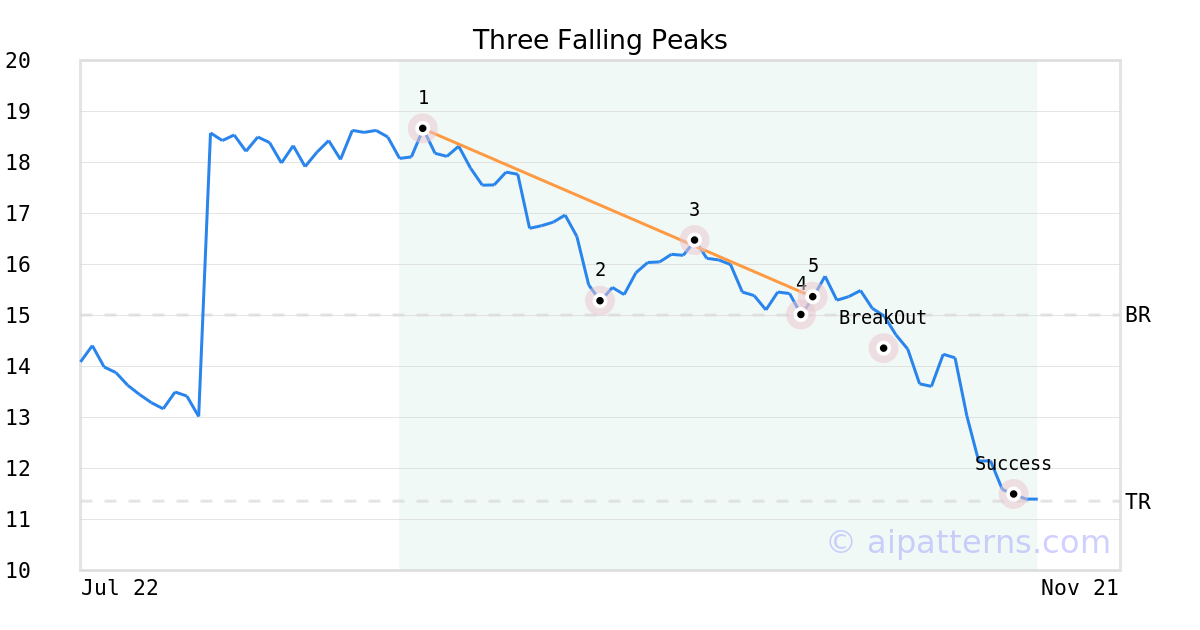 On October 17, 2025, A.I.dvisor detected a Three Falling Peaks Pattern (Bearish) for Grocery Outlet Holding Corp (GO, $15.36). 10 days later, on October 27, 2025, A.I.dvisor confirmed the Bearish pattern, setting a target price of the stock. On November 11, 2025, the stock hit the target price of $11.36 – resulting in a +2 gain for traders who shorted the stock on the pattern detection date.