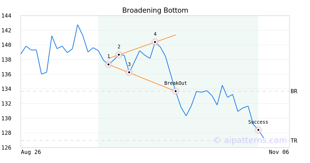 On October 08, 2025, A.I.dvisor detected a Broadening Bottom Pattern (Bearish) for Genuine Parts Company (GPC, $133.68). On October 08, 2025, A.I.dvisor confirmed the Bearish pattern, setting a target price of the stock. On October 30, 2025, the stock hit the target price of $126.97 – resulting in a gain for traders who shorted the stock on the pattern detection date.