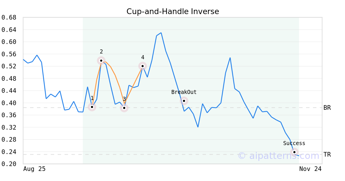 On October 01, 2025, A.I.dvisor detected a Cup-and-Handle Inverse Pattern (Bearish) for Hyperscale Data Inc (GPUS, $0.52). 13 days later, on October 14, 2025, A.I.dvisor confirmed the Bearish pattern, setting a target price of the stock. On November 17, 2025, the stock hit the target price of $0.23 – resulting in a +5 gain for traders who shorted the stock on the pattern detection date.