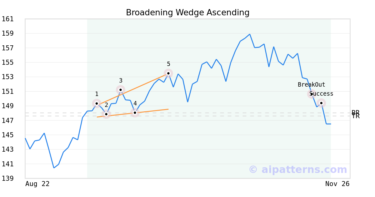 On October 06, 2025, A.I.dvisor detected a Broadening Wedge Ascending Pattern (Bearish) for First Trust NASDAQ® Cln Edge®StGidIfsETF (GRID, $153.47). 42 days later, on November 17, 2025, A.I.dvisor confirmed the Bearish pattern, setting a target price of the stock. On November 19, 2025, the stock hit the target price of $147.61 – resulting in a gain for traders who shorted the stock on the pattern detection date.