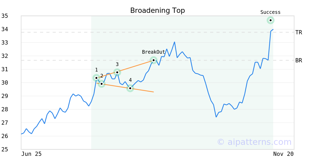 On September 08, 2025, A.I.dvisor detected a Broadening Top Pattern (Bullish) for Global Ship Lease (GSL, $31.67). On September 08, 2025, A.I.dvisor confirmed the Bullish pattern, setting a target price of $33.77. 63 days later, on November 10, 2025, GSL reached the target price resulting in a for traders who took a long position in the stock.