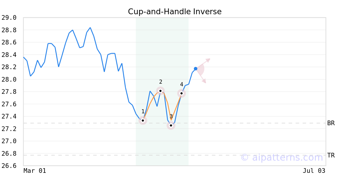 A.I.dvisor detected a bearish Cup-and-Handle Inverse pattern for GTCEX stock. This pattern was detected on May 06, 2024 . The odds of reaching the target price are 6. The Inverted Cup-and-Handle (sometimes called Inverted Cup-and-Holder) pattern forms when prices rise then decline to create an upside-down “U”like shape (1, 2, 3, also known as the Cup), followed by a shorter relatively straight price increase that bounces from the right lip (from 3 to 4, creating the Handle). Consider selling the security short or buying a put option at the downward breakout level. The confirmation move is the breakout of the price below the right cup lip.