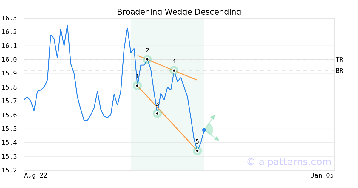 The Broadening Wedge Descending pattern forms when the price of a security makes lower lows (1, 3, 5) and lower highs (2, 4), forming a downtrend.