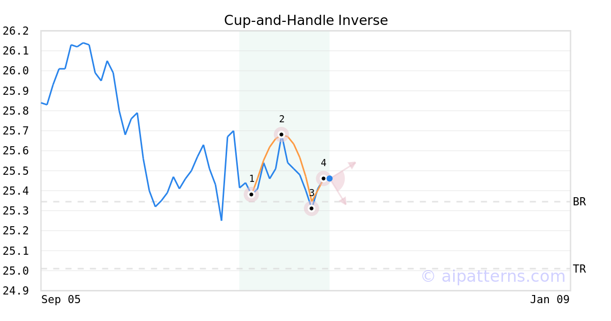 The Inverted Cup-and-Handle (sometimes called Inverted Cup-and-Holder) pattern forms when prices rise then decline to create an upside-down “U”like shape (1, 2, 3, also known as the Cup), followed by a shorter relatively straight price increase that bounces from the right lip (from 3 to 4, creating the Handle).