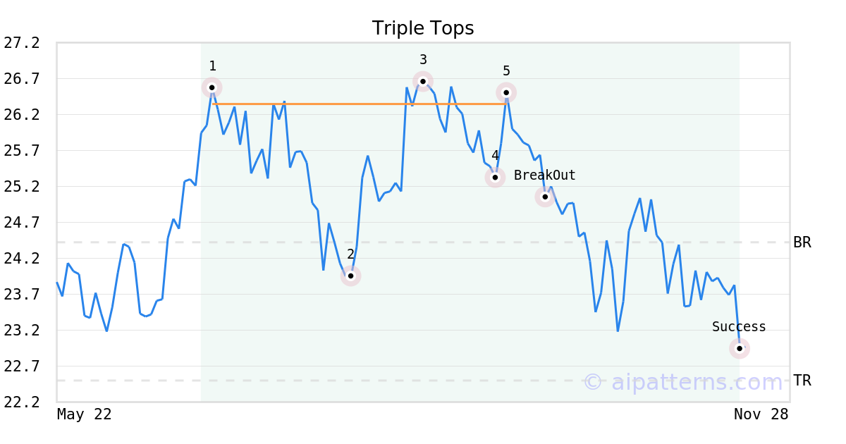 On September 18, 2025, A.I.dvisor detected a Triple Tops Pattern (Bearish) for HBT Financial (HBT, $26.27). 11 days later, on September 29, 2025, A.I.dvisor confirmed the Bearish pattern, setting a target price of the stock. On November 17, 2025, the stock hit the target price of $22.50 – resulting in a +1 gain for traders who shorted the stock on the pattern detection date.