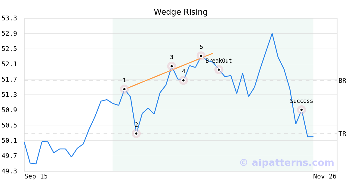 On October 27, 2025, A.I.dvisor detected a Wedge Rising Pattern (Bearish) for WisdomTree Europe Hedged Equity ETF (HEDJ, $52.31). 3 days later, on October 30, 2025, A.I.dvisor confirmed the Bearish pattern, setting a target price of the stock. On November 19, 2025, the stock hit the target price of $50.28 – resulting in a gain for traders who shorted the stock on the pattern detection date.