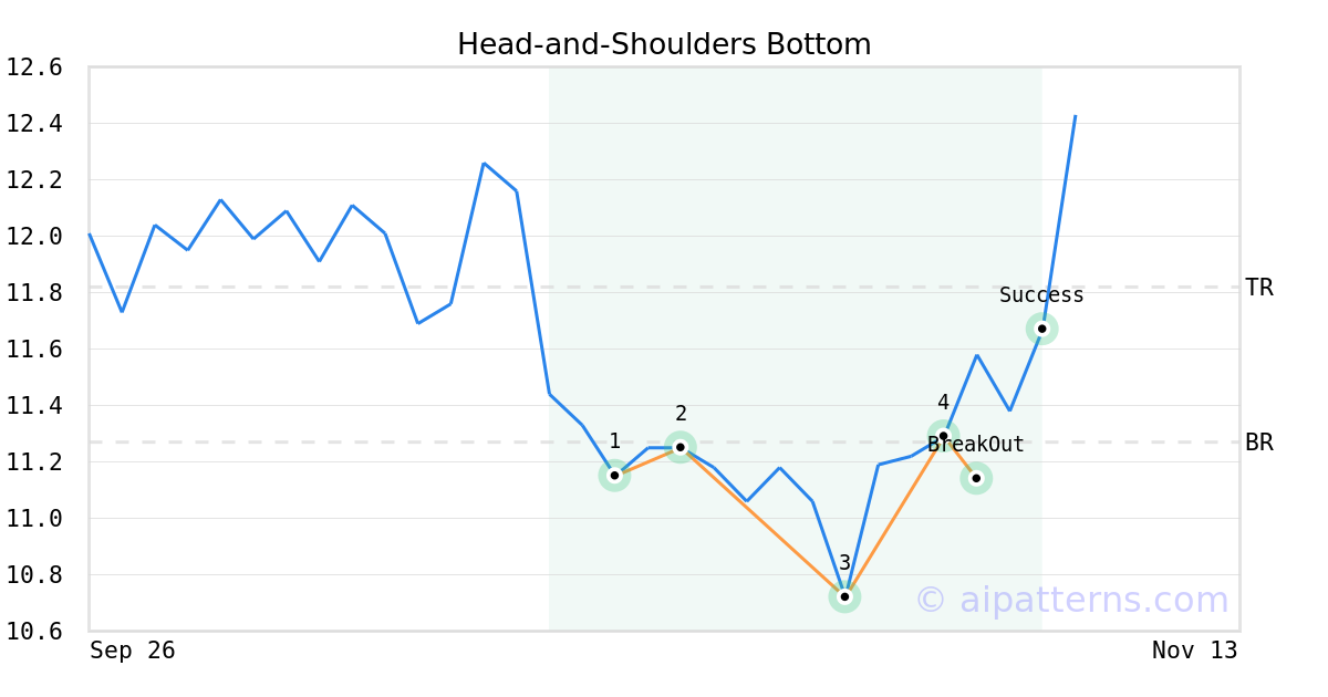 On November 04, 2025, A.I.dvisor detected a Head-and-Shoulders Bottom Pattern (Bullish) for Hagerty (HGTY, $11.14). On November 04, 2025, A.I.dvisor confirmed the Bullish pattern, setting a target price of $11.82. 2 days later, on November 06, 2025, HGTY reached the target price resulting in a for traders who took a long position in the stock.