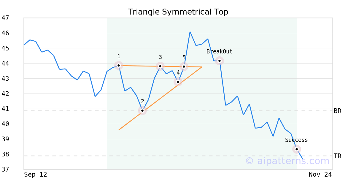 On October 21, 2025, A.I.dvisor detected a Triangle Symmetrical Top Pattern (Bearish) for Hilton Grand Vacations (HGV, $43.78). 8 days later, on October 29, 2025, A.I.dvisor confirmed the Bearish pattern, setting a target price of the stock. On November 17, 2025, the stock hit the target price of $37.89 – resulting in a +1 gain for traders who shorted the stock on the pattern detection date.