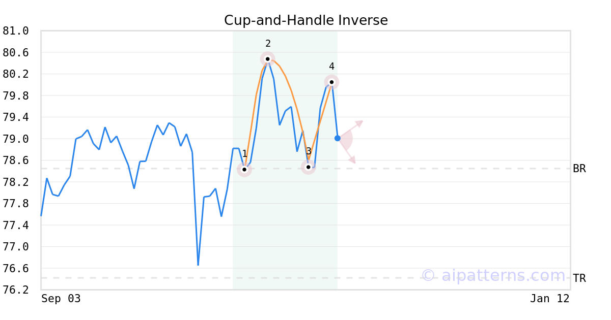 The Inverted Cup-and-Handle (sometimes called Inverted Cup-and-Holder) pattern forms when prices rise then decline to create an upside-down “U”like shape (1, 2, 3, also known as the Cup), followed by a shorter relatively straight price increase that bounces from the right lip (from 3 to 4, creating the Handle).