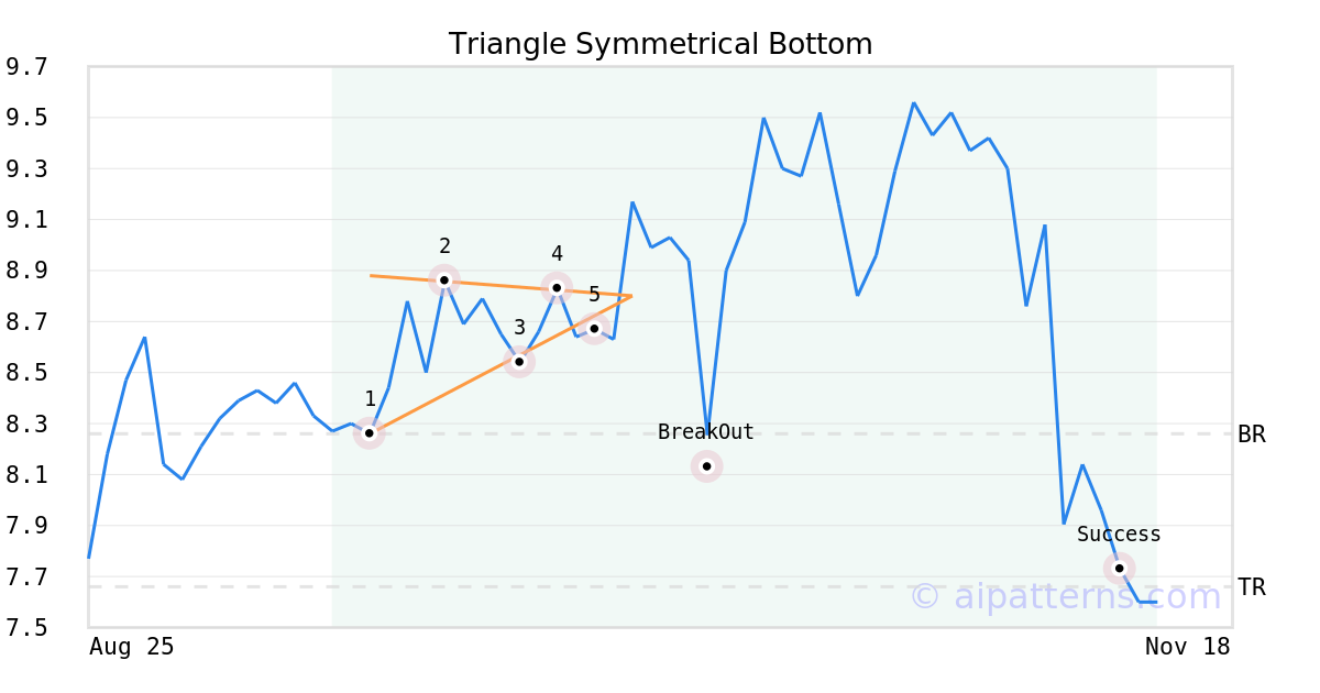 On October 02, 2025, A.I.dvisor detected a Triangle Symmetrical Bottom Pattern (Bearish) for Himax Technologies (HIMX, $8.67). 8 days later, on October 10, 2025, A.I.dvisor confirmed the Bearish pattern, setting a target price of the stock. On November 11, 2025, the stock hit the target price of $7.66 – resulting in a +1 gain for traders who shorted the stock on the pattern detection date.