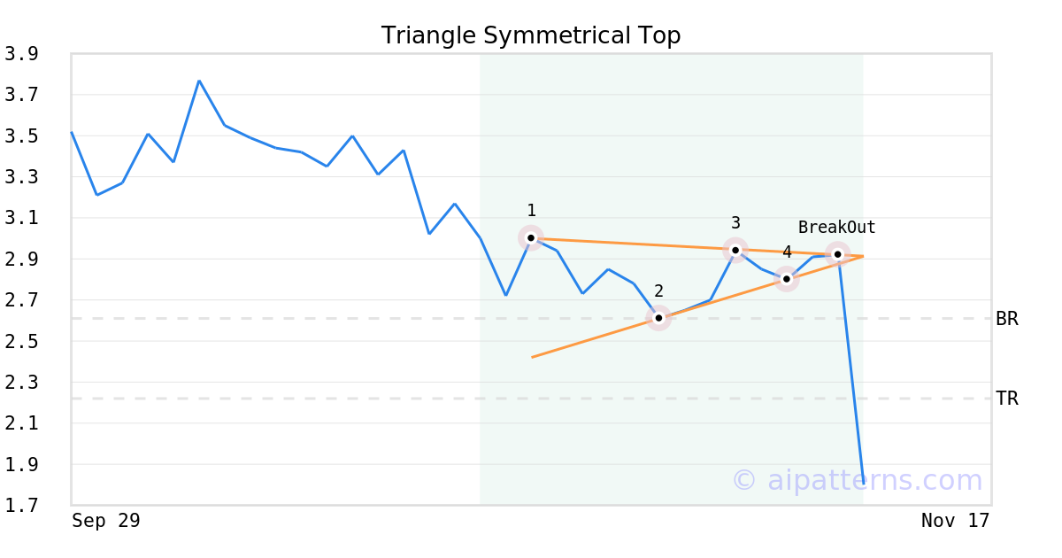 On November 10, 2025, A.I.dvisor detected a Triangle Symmetrical Top Pattern (Bearish) for Health In Tech Inc (HIT, $2.92). On November 10, 2025, A.I.dvisor confirmed the Bearish pattern, setting a target price of the stock. On November 10, 2025, the stock hit the target price of $2.22 – resulting in a gain for traders who shorted the stock on the pattern detection date.