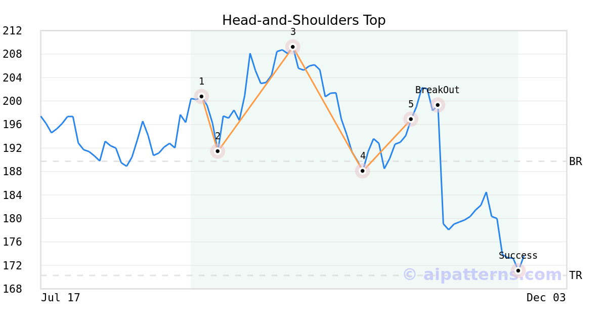 On October 23, 2025, A.I.dvisor detected a Head-and-Shoulders Top Pattern (Bearish) for Houlihan Lokey (HLI, $196.88). 7 days later, on October 30, 2025, A.I.dvisor confirmed the Bearish pattern, setting a target price of the stock. On November 20, 2025, the stock hit the target price of $170.29 – resulting in a +1 gain for traders who shorted the stock on the pattern detection date.