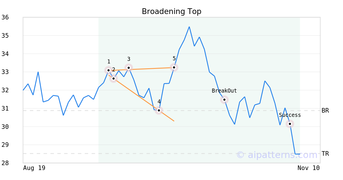 On October 01, 2025, A.I.dvisor detected a Broadening Top Pattern (Bearish) for VanEck Bitcoin ETF (HODL, $33.24). 14 days later, on October 15, 2025, A.I.dvisor confirmed the Bearish pattern, setting a target price of the stock. On November 03, 2025, the stock hit the target price of $28.52 – resulting in a gain for traders who shorted the stock on the pattern detection date.