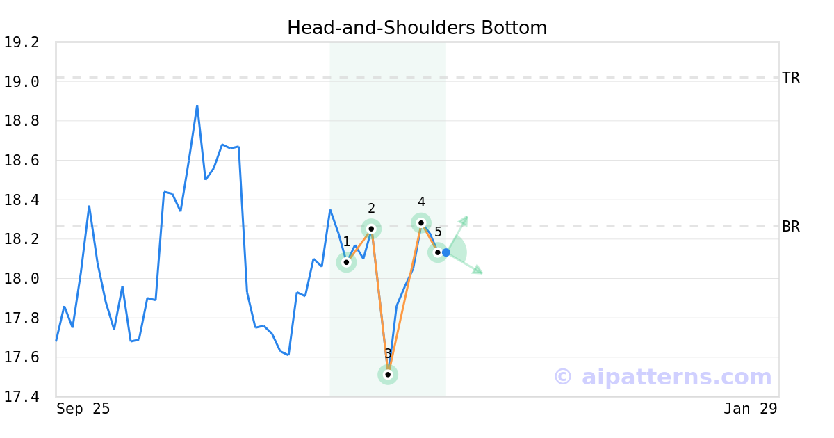 The Head-and-Shoulders Bottom pattern is formed when the price of a security creates a center trough (the inverted head, labeled 3) and the left and right inverted shoulders (1, 5). After reaching the lowest low (the Head, 3) the next low is shallower and the trend reverses course to the upside.
