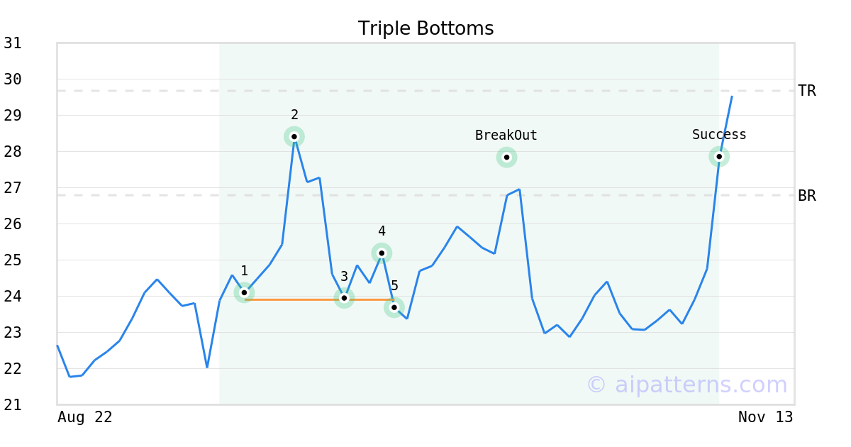 On October 01, 2025, A.I.dvisor detected a Triple Bottoms Pattern (Bullish) for Heritage Insurance Holdings (HRTG, $23.68). On October 14, 2025, A.I.dvisor confirmed the Bullish pattern, setting a target price of $29.68. 23 days later, on November 06, 2025, HRTG reached the target price resulting in a +1 for traders who took a long position in the stock.