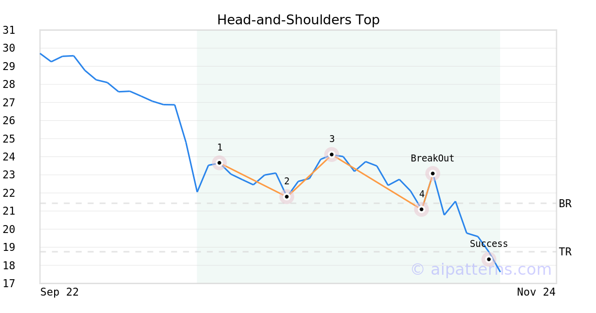 On November 10, 2025, A.I.dvisor detected a Head-and-Shoulders Top Pattern (Bearish) for Hesai Group American Depositary Share each ADS represents one (HSAI, $23.06). On November 10, 2025, A.I.dvisor confirmed the Bearish pattern, setting a target price of the stock. On November 17, 2025, the stock hit the target price of $18.75 – resulting in a +2 gain for traders who shorted the stock on the pattern detection date.