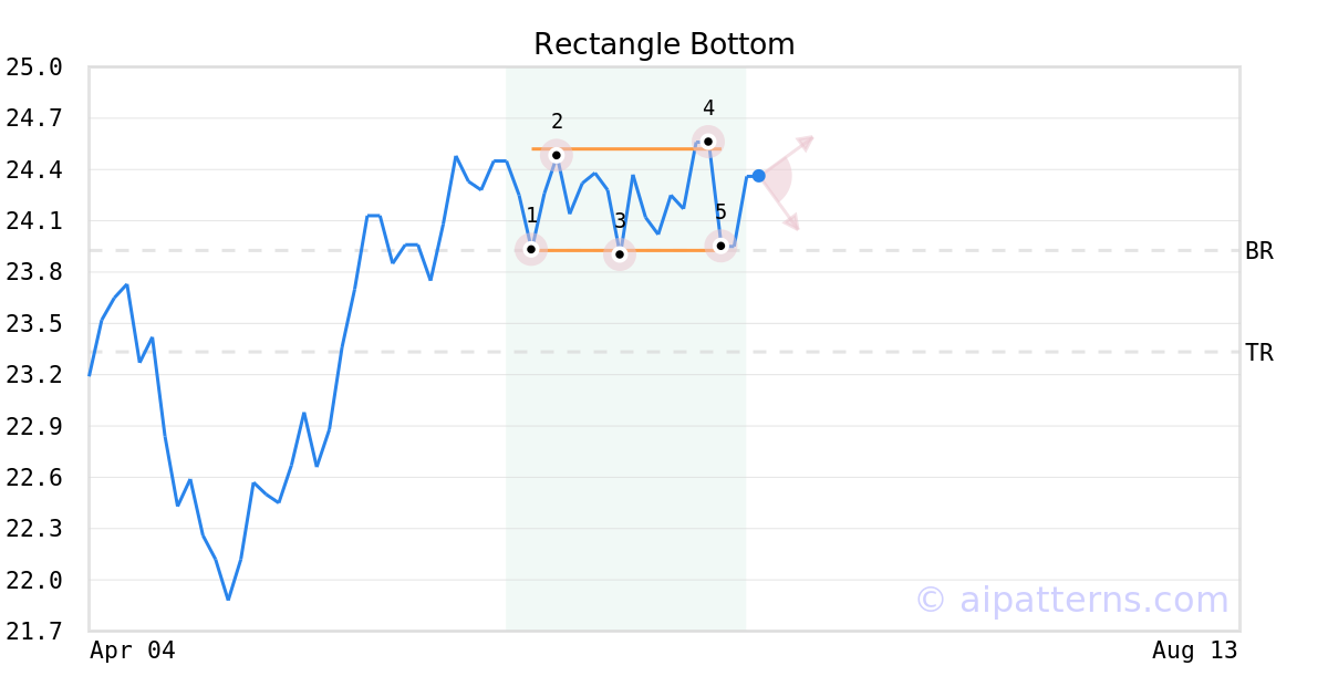 The Rectangle Bottom pattern forms when the price of a security is stuck in a range-bound motion, bouncing between support and resistance levels. Two horizontal lines (1, 3, 5) and (2, 4) form the pattern.