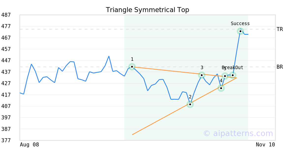 On October 23, 2025, A.I.dvisor detected a Triangle Symmetrical Top Pattern (Bullish) for Hubbell (HUBB, $433.27). On October 27, 2025, A.I.dvisor confirmed the Bullish pattern, setting a target price of $474.42. 2 days later, on October 29, 2025, HUBB reached the target price resulting in a for traders who took a long position in the stock.