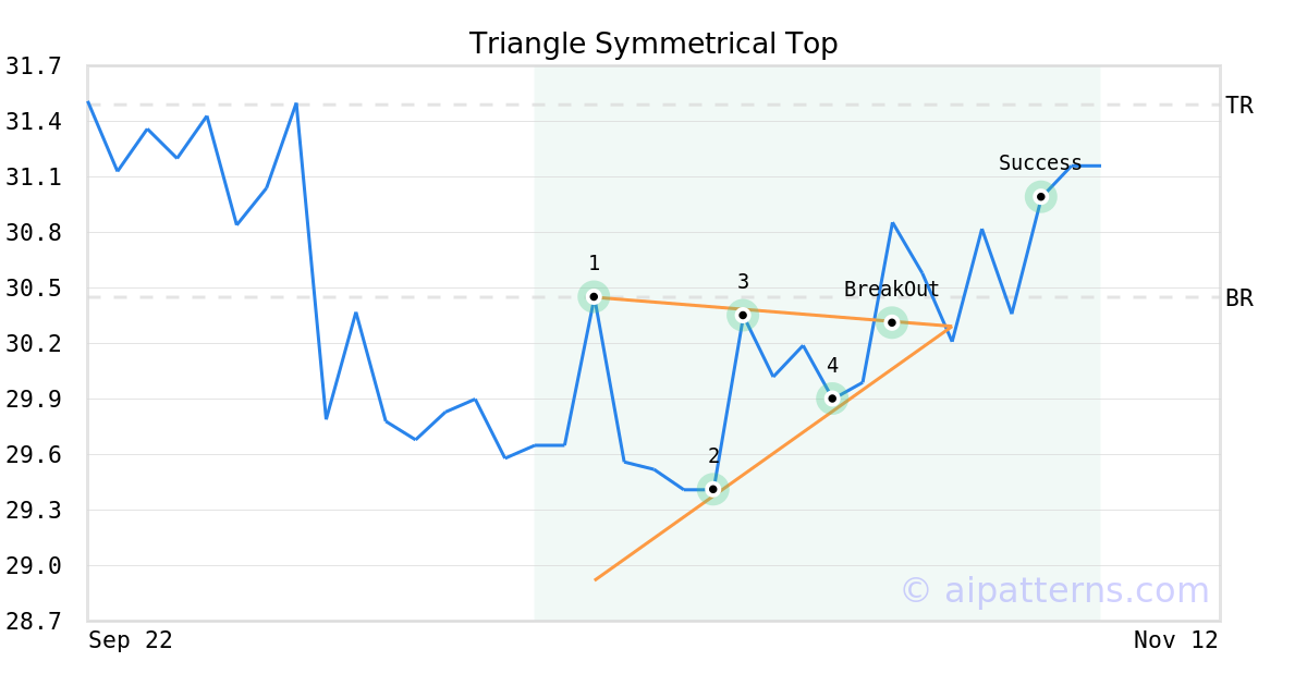 On October 29, 2025, A.I.dvisor detected a Triangle Symmetrical Top Pattern (Bullish) for Hawthorn Bancshares (HWBK, $30.31). On October 29, 2025, A.I.dvisor confirmed the Bullish pattern, setting a target price of $31.49. 7 days later, on November 05, 2025, HWBK reached the target price resulting in a for traders who took a long position in the stock.