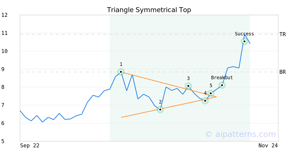 On November 07, 2025, A.I.dvisor detected a Triangle Symmetrical Top Pattern (Bullish) for Hycroft Mining Holding Corp (HYMC, $7.65). On November 11, 2025, A.I.dvisor confirmed the Bullish pattern, setting a target price of $10.93. 6 days later, on November 17, 2025, HYMC reached the target price resulting in a +3 for traders who took a long position in the stock.
