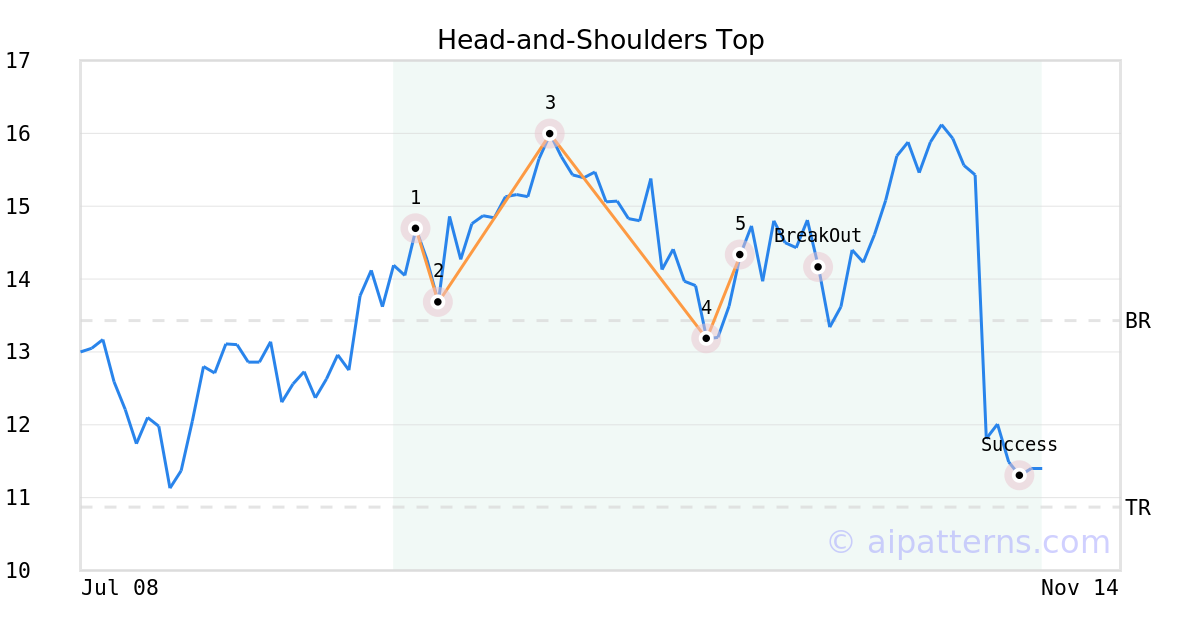 On September 30, 2025, A.I.dvisor detected a Head-and-Shoulders Top Pattern (Bearish) for Integra LifeSciences Holdings Corp (IART, $14.33). 9 days later, on October 09, 2025, A.I.dvisor confirmed the Bearish pattern, setting a target price of the stock. On November 04, 2025, the stock hit the target price of $10.87 – resulting in a +2 gain for traders who shorted the stock on the pattern detection date.
