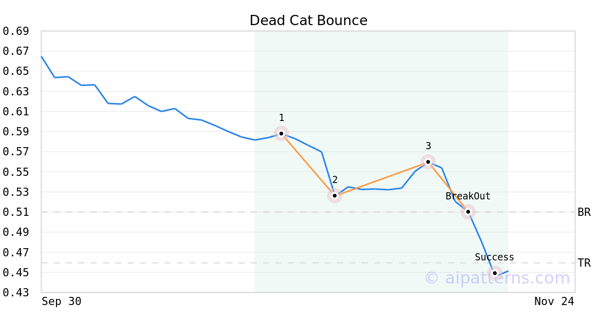 On November 13, 2025, A.I.dvisor detected a Dead Cat Bounce Pattern (Bearish) for Impact BioMedical Inc. (IBO, $0.51). On November 13, 2025, A.I.dvisor confirmed the Bearish pattern, setting a target price of the stock. On November 17, 2025, the stock hit the target price of $0.46 – resulting in a +1 gain for traders who shorted the stock on the pattern detection date.