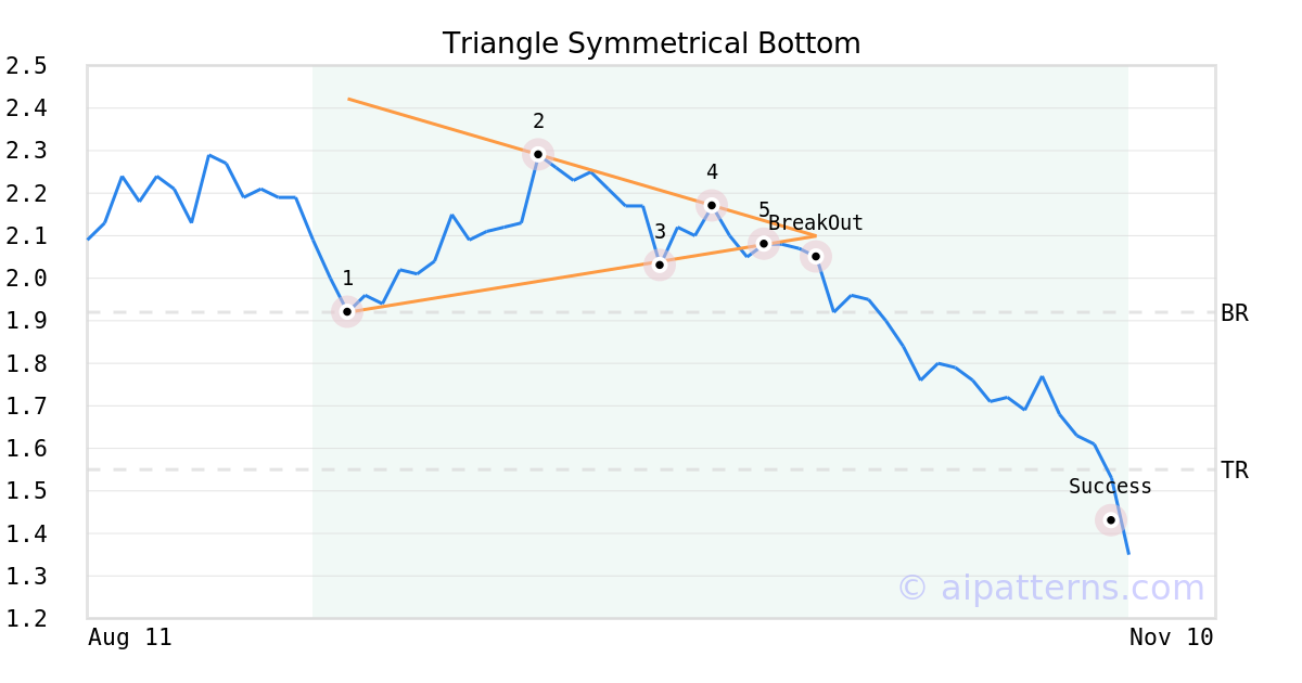 On October 06, 2025, A.I.dvisor detected a Triangle Symmetrical Bottom Pattern (Bearish) for Icon Energy Corp (ICON, $2.08). 3 days later, on October 09, 2025, A.I.dvisor confirmed the Bearish pattern, setting a target price of the stock. On November 03, 2025, the stock hit the target price of $1.55 – resulting in a +3 gain for traders who shorted the stock on the pattern detection date.