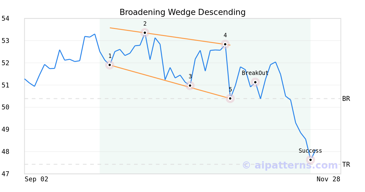 On October 29, 2025, A.I.dvisor detected a Broadening Wedge Descending Pattern (Bearish) for iShares Cybersecurity and Tech ETF (IHAK, $50.39). 7 days later, on November 05, 2025, A.I.dvisor confirmed the Bearish pattern, setting a target price of the stock. On November 20, 2025, the stock hit the target price of $47.43 – resulting in a gain for traders who shorted the stock on the pattern detection date.