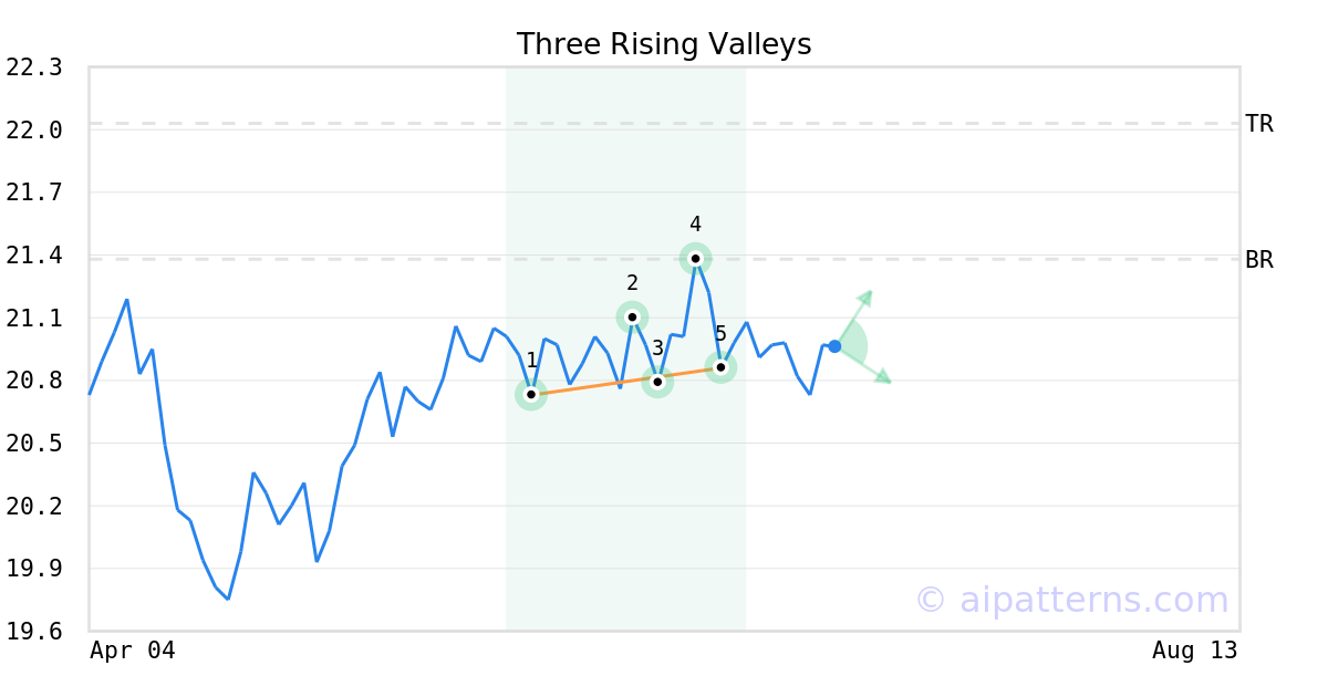The Three Rising Valleys pattern forms when three minor Lows (1, 3, 5) are arranged along an upward sloping trend line.