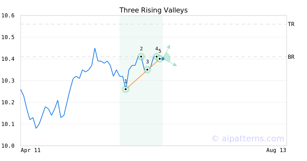 A.I.dvisor detected a bullish Three Rising Valleys pattern for IIASX stock. This pattern was detected on June 14, 2024 . The odds of reaching the target price are 6. The Three Rising Valleys pattern forms when three minor Lows (1, 3, 5) are arranged along an upward sloping trend line. Consider buying a security or call option at the breakout price level. When trading, wait for the confirmation move, which is when the price rises above the breakout level.