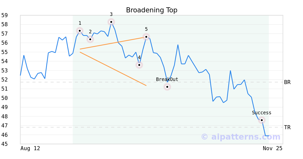 On October 02, 2025, A.I.dvisor detected a Broadening Top Pattern (Bearish) for Innovative Industrial Properties (IIPR, $56.64). 8 days later, on October 10, 2025, A.I.dvisor confirmed the Bearish pattern, setting a target price of the stock. On November 18, 2025, the stock hit the target price of $46.82 – resulting in a +1 gain for traders who shorted the stock on the pattern detection date.