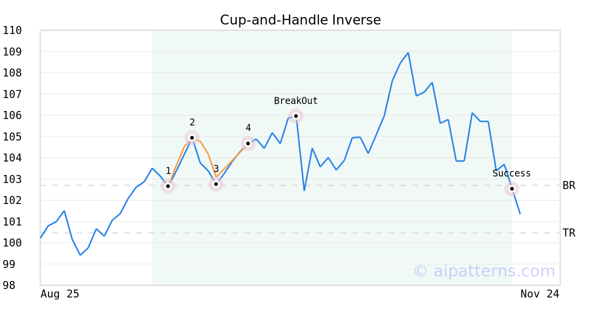 On October 01, 2025, A.I.dvisor detected a Cup-and-Handle Inverse Pattern (Bearish) for iShares Morningstar Growth ETF (ILCG, $104.66). 8 days later, on October 09, 2025, A.I.dvisor confirmed the Bearish pattern, setting a target price of the stock. On November 17, 2025, the stock hit the target price of $100.47 – resulting in a gain for traders who shorted the stock on the pattern detection date.