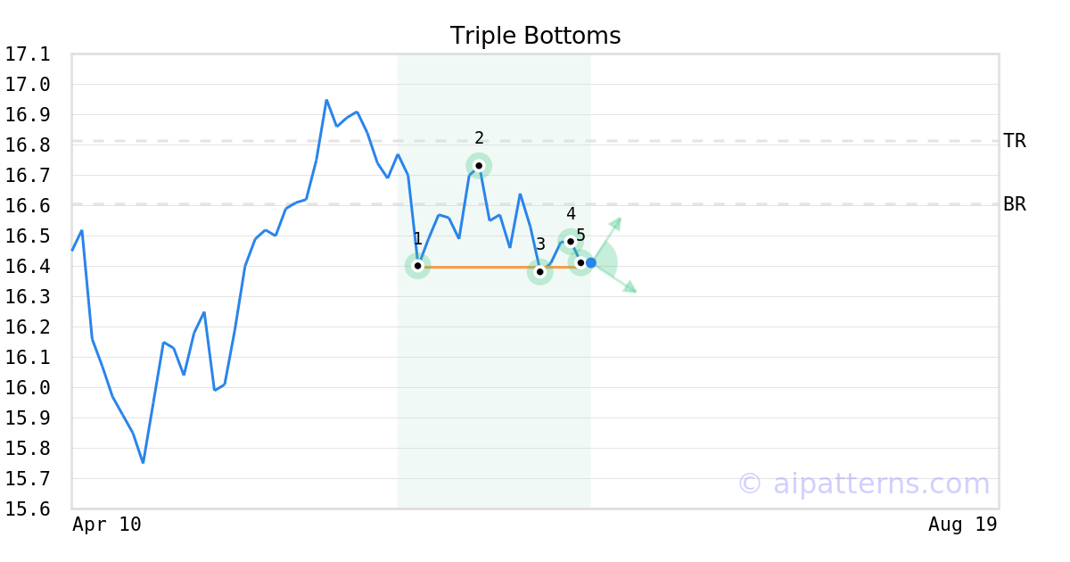 The Triple Bottom pattern appears when there are three distinct low points (1, 3, 5) that represent a consistent support level.