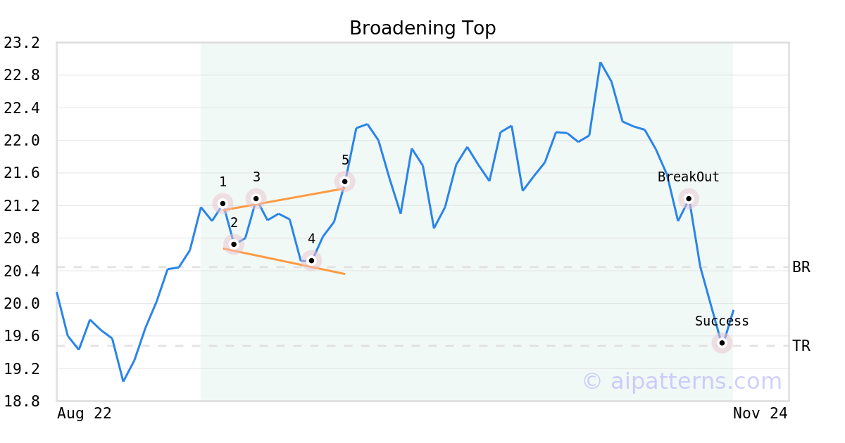 On September 30, 2025, A.I.dvisor detected a Broadening Top Pattern (Bearish) for Ingram Micro Holding Corp (INGM, $21.41). 43 days later, on November 12, 2025, A.I.dvisor confirmed the Bearish pattern, setting a target price of the stock. On November 17, 2025, the stock hit the target price of $19.48 – resulting in a gain for traders who shorted the stock on the pattern detection date.