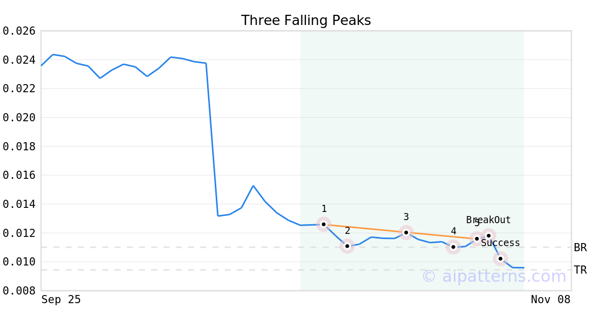 On November 01, 2025, A.I.dvisor detected a Three Falling Peaks Pattern (Bearish) for IoTeX cryptocurrency (IOTX.X, $0.011556). 1 day later, on November 02, 2025, A.I.dvisor confirmed the Bearish pattern, setting a target price of the stock. On November 03, 2025, the stock hit the target price of $0.009440 – resulting in a +1 gain for traders who shorted the stock on the pattern detection date.