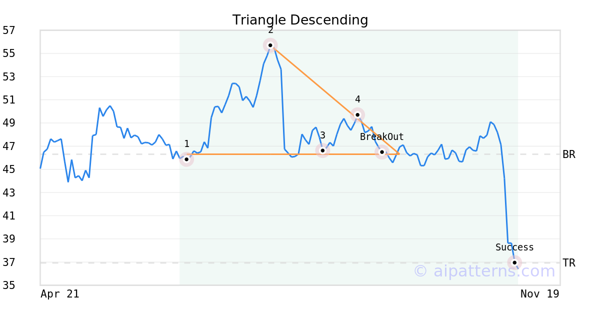 On September 10, 2025, A.I.dvisor detected a Triangle Descending Pattern (Bearish) for International Paper Co (IP, $46.47). On September 10, 2025, A.I.dvisor confirmed the Bearish pattern, setting a target price of the stock. On November 03, 2025, the stock hit the target price of $36.93 – resulting in a +2 gain for traders who shorted the stock on the pattern detection date.