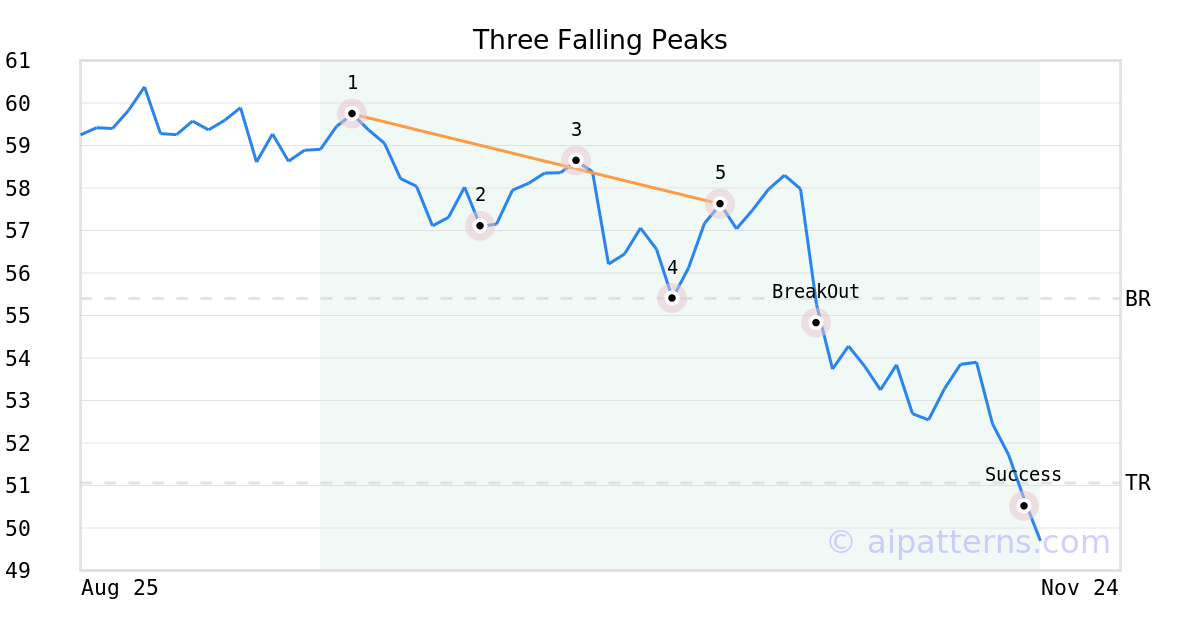 On October 21, 2025, A.I.dvisor detected a Three Falling Peaks Pattern (Bearish) for Amplify Digital Payments ETF (IPAY, $57.62). 8 days later, on October 29, 2025, A.I.dvisor confirmed the Bearish pattern, setting a target price of the stock. On November 17, 2025, the stock hit the target price of $51.06 – resulting in a +1 gain for traders who shorted the stock on the pattern detection date.