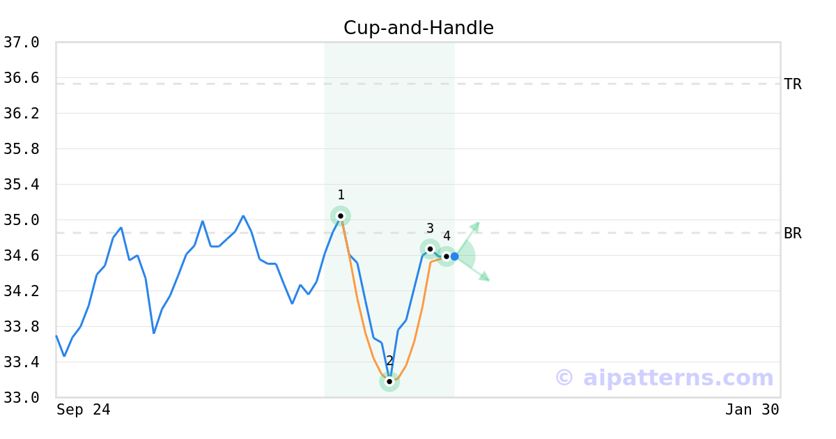The Cup-and-Handle (sometimes called Cup-and-Holder) pattern is formed when the price of a security initially declines and then rises to form a “U”-like rounded shape (1, 2, 3, also known as the Cup). Once it forms the right lip, it is characterized by short, relatively straight price decline (from 3 to 4) forming the handle.