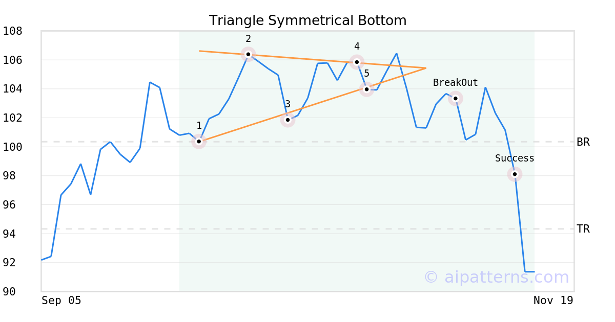 On October 22, 2025, A.I.dvisor detected a Triangle Symmetrical Bottom Pattern (Bearish) for Iron Mountain (IRM, $103.95). 13 days later, on November 04, 2025, A.I.dvisor confirmed the Bearish pattern, setting a target price of the stock. On November 12, 2025, the stock hit the target price of $94.33 – resulting in a gain for traders who shorted the stock on the pattern detection date.