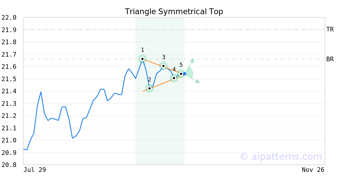 The Symmetrical Triangle Top pattern forms when the price of a security fails to retest a high or low and ultimately forms two narrowing trend lines.
