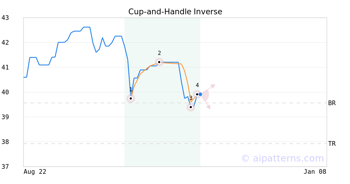 The Inverted Cup-and-Handle (sometimes called Inverted Cup-and-Holder) pattern forms when prices rise then decline to create an upside-down “U”like shape (1, 2, 3, also known as the Cup), followed by a shorter relatively straight price increase that bounces from the right lip (from 3 to 4, creating the Handle).