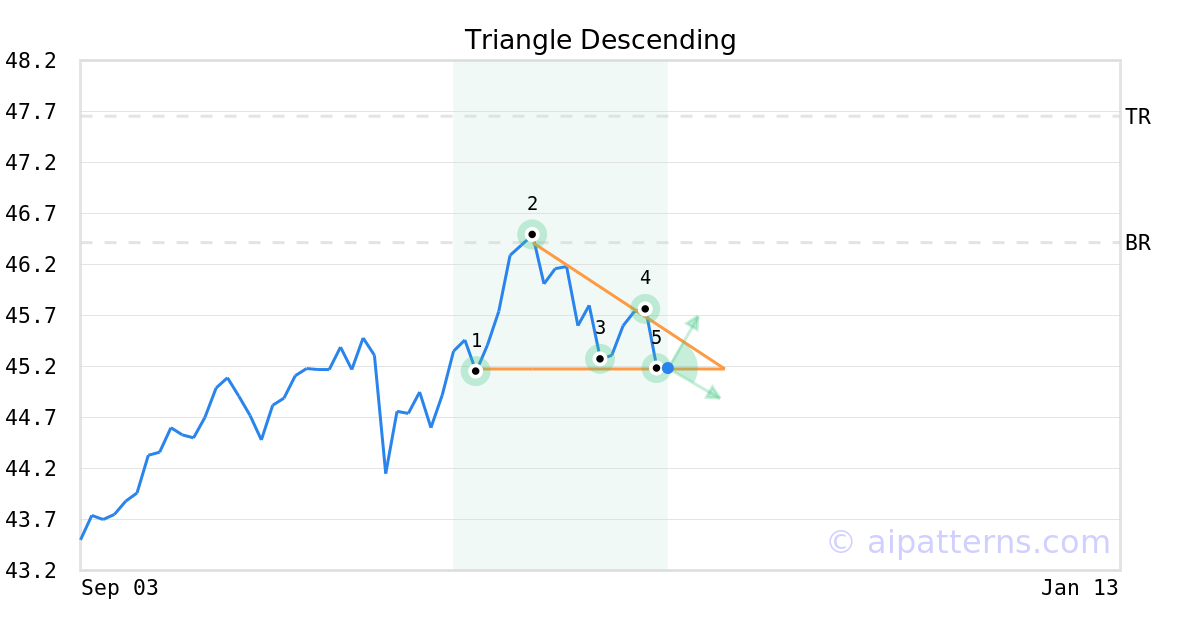 The Descending Triangle pattern is formed when the price of a security establishes a support level (1, 3, 5) and bounces off that level to a declining resistance level, creating a down-sloping top line (2, 4).