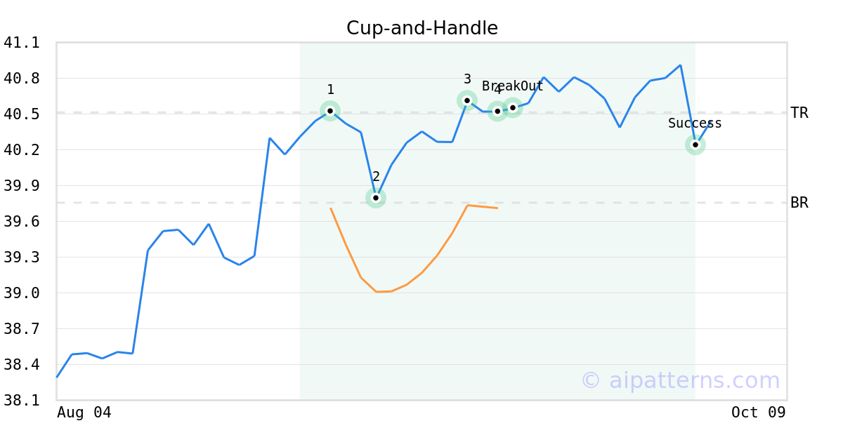 On September 15, 2025, A.I.dvisor detected a Cup-and-Handle Pattern (Bullish) for iShares Russell 2000 BuyWrite ETF (IWMW, $39.71). On September 16, 2025, A.I.dvisor confirmed the Bullish pattern, setting a target price of $40.51. 16 days later, on October 02, 2025, IWMW reached the target price resulting in a for traders who took a long position in the stock.