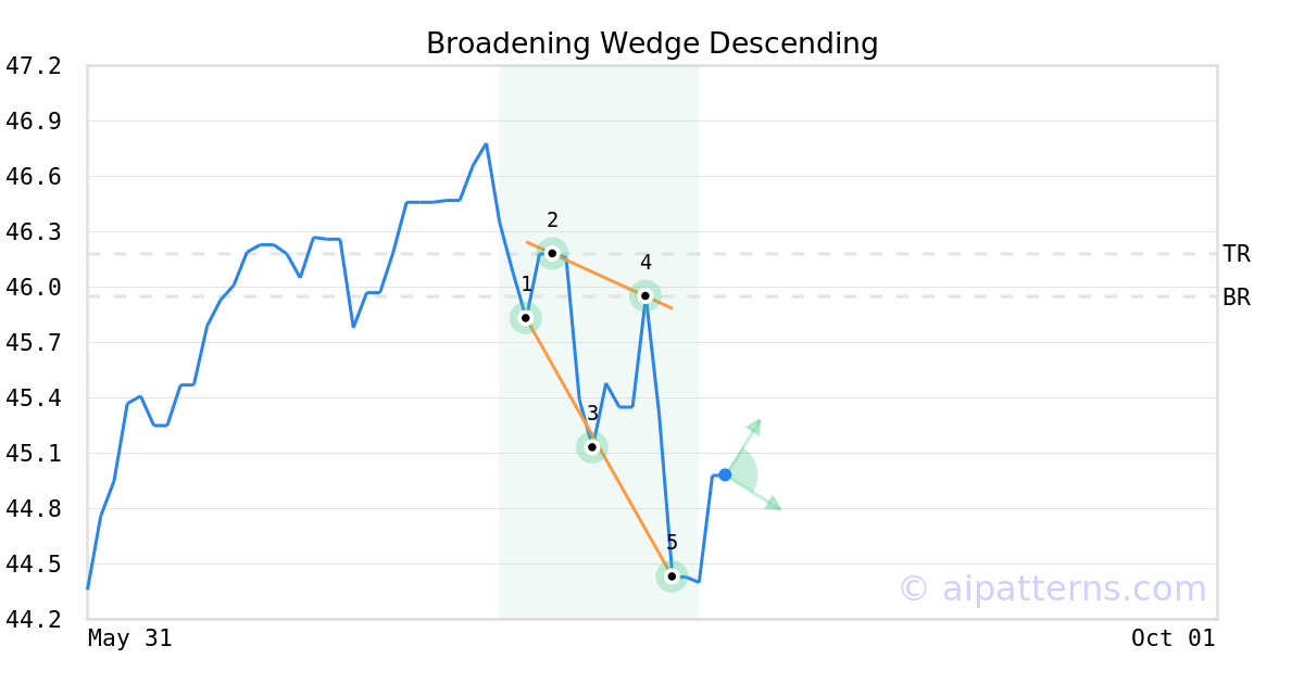 A.I.dvisor detected a bullish Broadening Wedge Descending pattern for JDBRX stock. This pattern was detected on August 05, 2024 . The odds of reaching the target price are 6. The Broadening Wedge Descending pattern forms when the price of a security makes lower lows (1, 3, 5) and lower highs (2, 4), forming a downtrend. Consider buying a security or call option at the upward breakout price level.