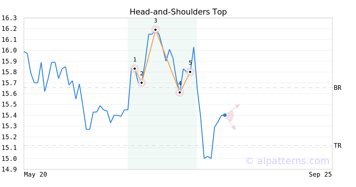 A.I.dvisor detected a bearish Head-and-Shoulders Top pattern for JDITX stock. This pattern was detected on July 30, 2024 . The odds of reaching the target price are 6. The pattern forms with a center peak (the Head, labeled 3) and left and right Shoulders (1, 5). Eventually the security stops testing highs and reverses trend into a decline. Consider selling a security short before it declines or buying a put option to benefit from the price decline. To improve success chances, wait for a confirmation move: allow the price to break below the Neckline level (2, 4), which is calculated as the average of the two lows between the Head and the Shoulders.