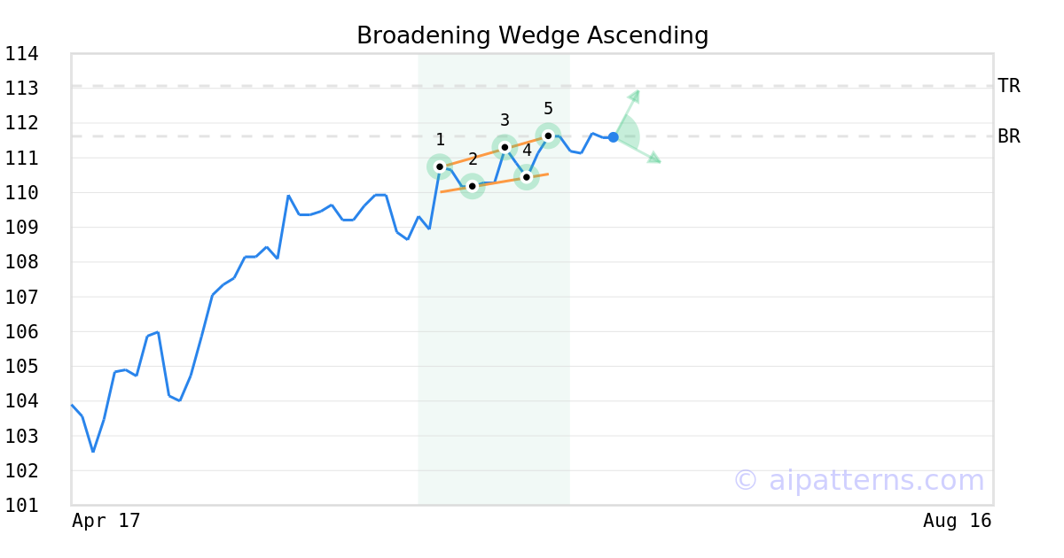 A.I.dvisor detected a bullish Broadening Wedge Ascending pattern for JDWRX stock. This pattern was detected on June 20, 2024 . The odds of reaching the target price are 6. The Broadening Wedge Ascending pattern forms when the price of a security progressively makes higher highs (1, 3) and higher lows (2, 4), following two widening trend lines. Consider buying a security or call option at the upward breakout price/entry point.