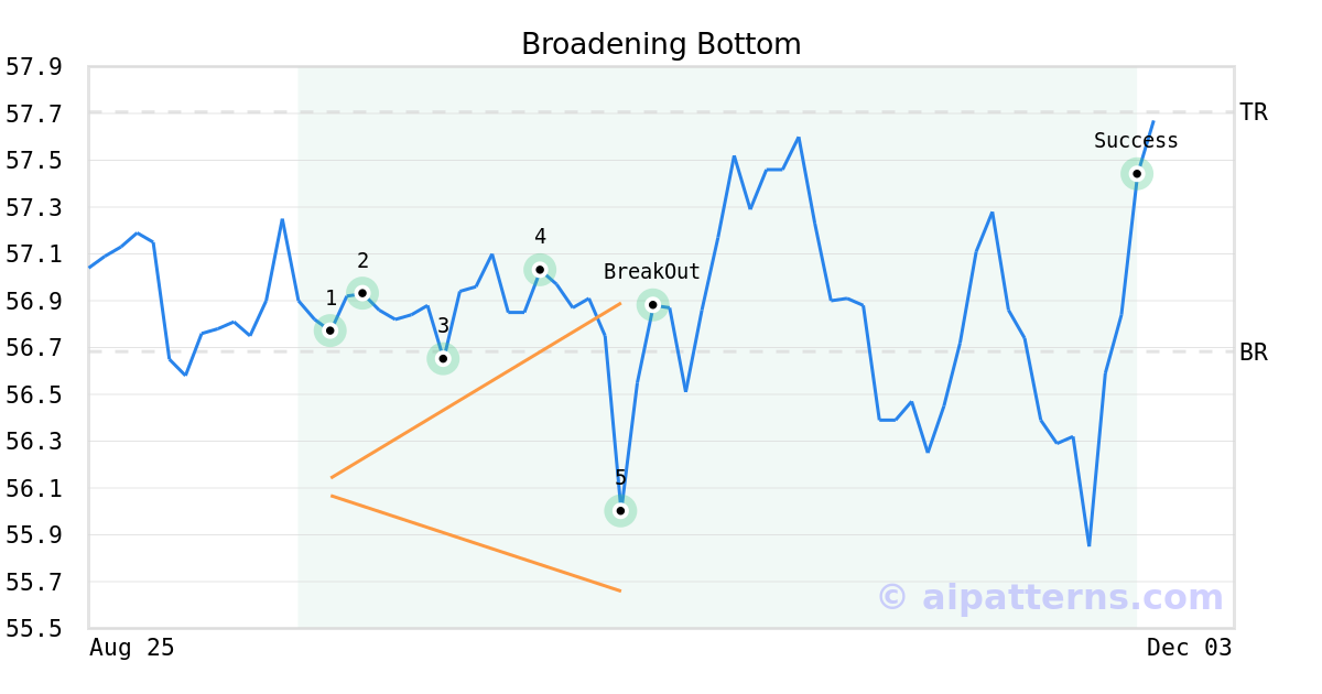 On October 10, 2025, A.I.dvisor detected a Broadening Bottom Pattern (Bullish) for JPMorgan Equity Premium Income ETF (JEPI, $55.66). On October 14, 2025, A.I.dvisor confirmed the Bullish pattern, setting a target price of $57.71. 42 days later, on November 25, 2025, JEPI reached the target price resulting in a for traders who took a long position in the stock.