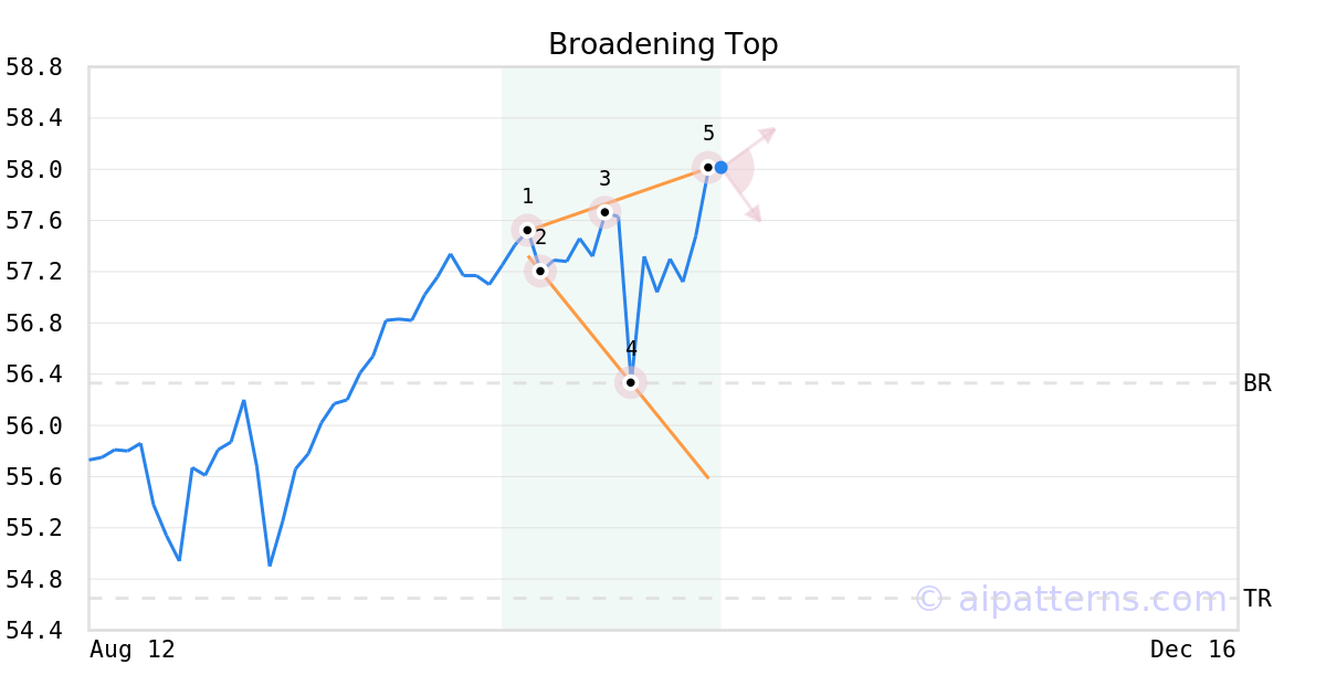 The Broadening Top pattern forms when a security price makes higher highs (1, 3, 5) and lower lows (2, 4) following two widening trend lines.