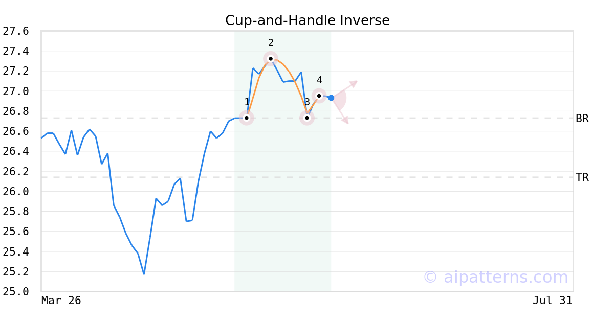 A.I.dvisor detected a bearish Cup-and-Handle Inverse pattern for JIGHX stock. This pattern was detected on June 03, 2024 . The odds of reaching the target price are 6. The Inverted Cup-and-Handle (sometimes called Inverted Cup-and-Holder) pattern forms when prices rise then decline to create an upside-down “U”like shape (1, 2, 3, also known as the Cup), followed by a shorter relatively straight price increase that bounces from the right lip (from 3 to 4, creating the Handle). Consider selling the security short or buying a put option at the downward breakout level. The confirmation move is the breakout of the price below the right cup lip.